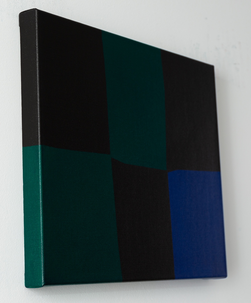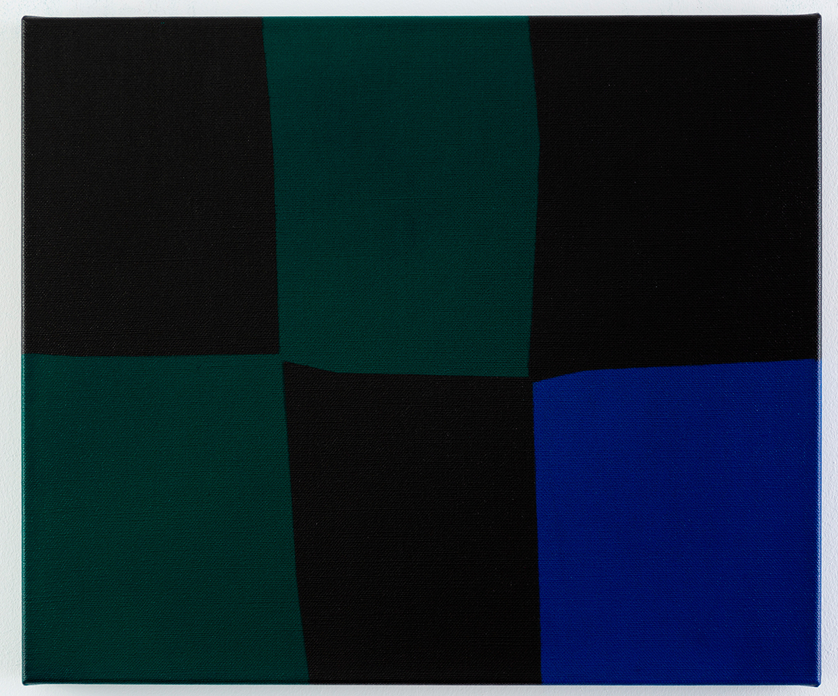 Dieses abstrakte Gemälde verbindet tiefes Schwarz mit nuancierten Grünflächen und einem klar gesetzten Blau.
