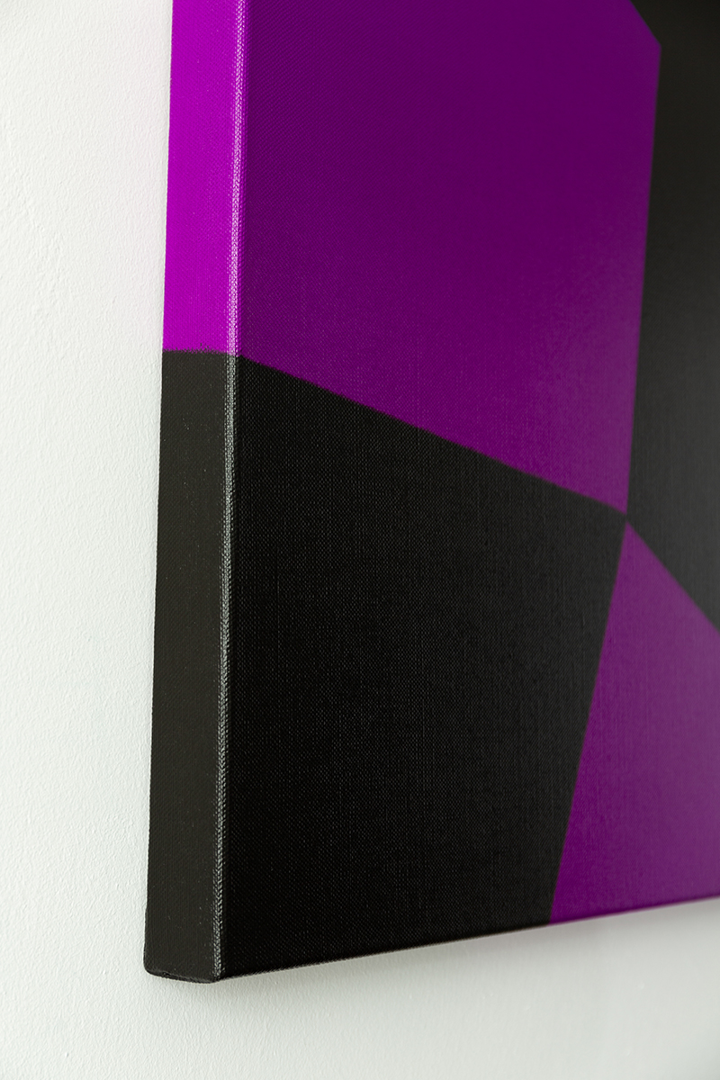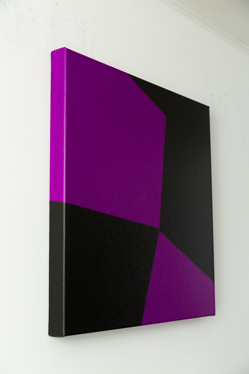 Gemälde: Abstrakt, mit violetten und schwarzen Flächen, die sich ineinander verschränken. Minimalistische abstrakte Farbfeldmalerei.
